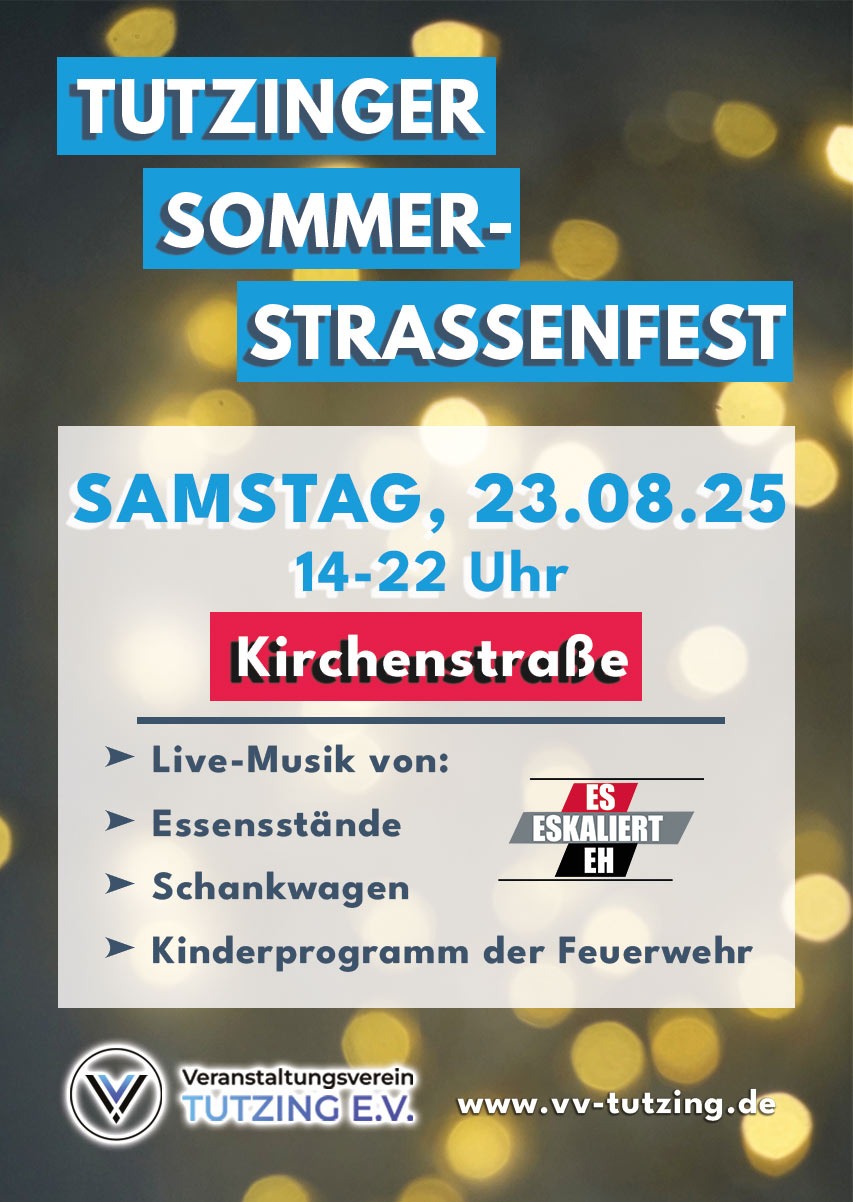 Am Samstag, den 23.08.25, findet das dritte Tutzinger Sommerstraßenfest statt! Aufgrund der Baustellensituation an der Hauptstraße findet das Fest dieses Jahr erstmalig auf der KIRCHENSTRASSE statt (Höhe Kino). Dabei ist folgendes geboten: